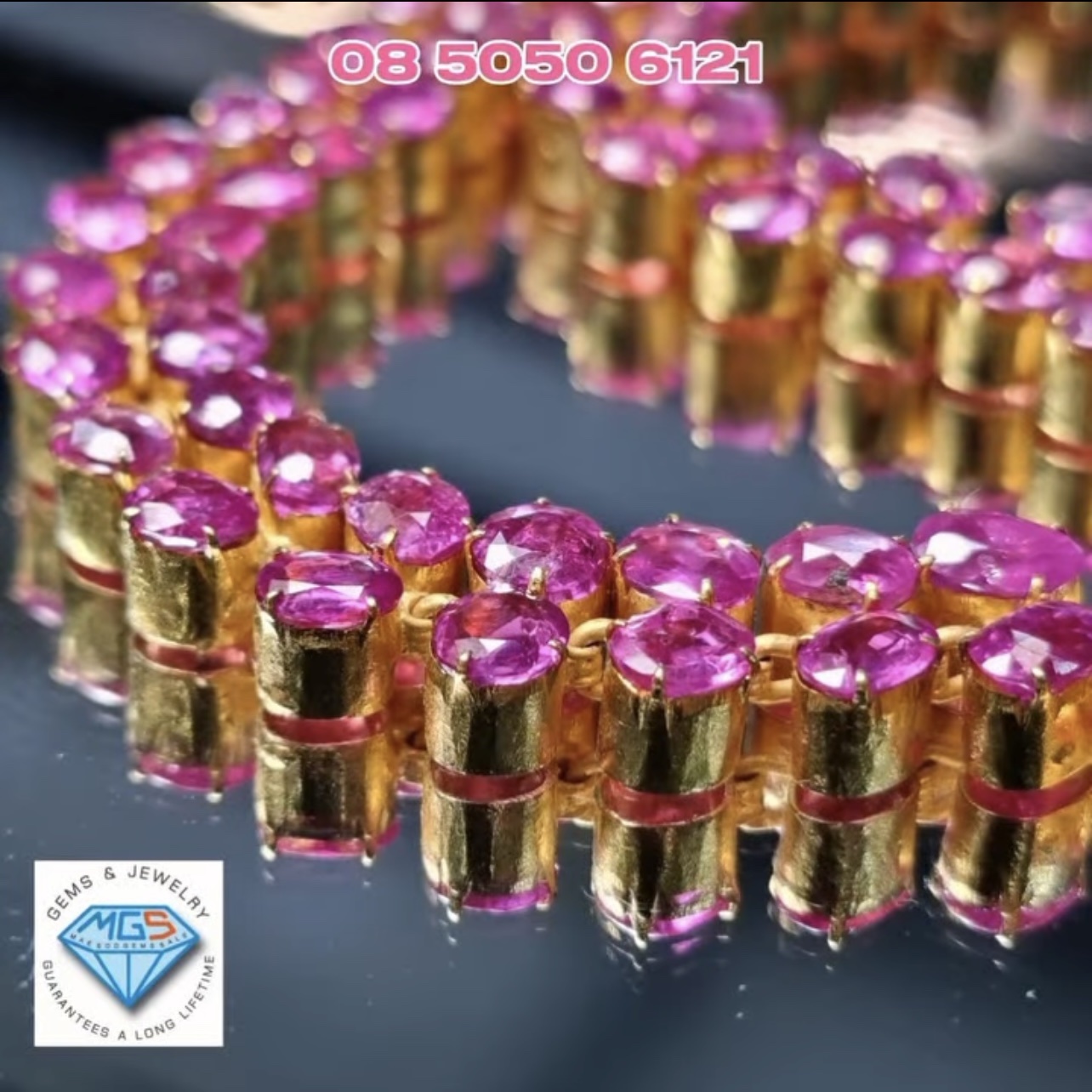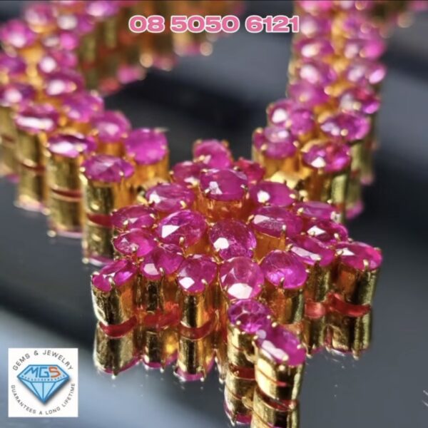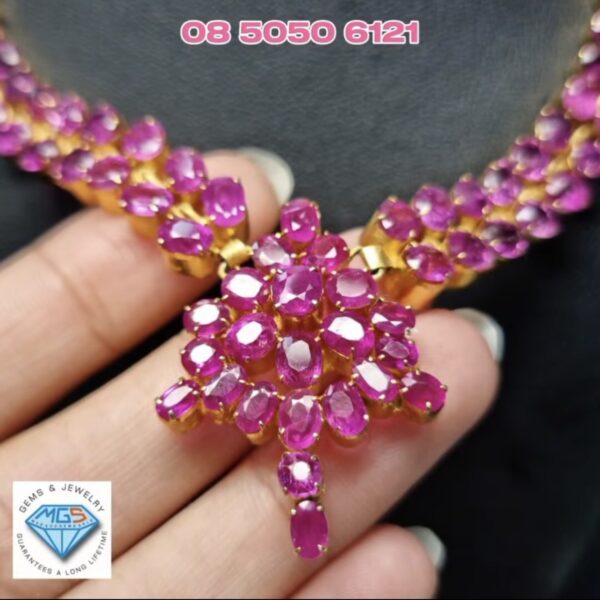 สร้อยทับทิมพม่า เจียรไน ไฟดี สีแดงชมพู เผาเก่า จำนวน 36 เม็ด นน.รวม 65 กะรัต โดยประมาณ(จี้กลาง 2 เม็ด)
