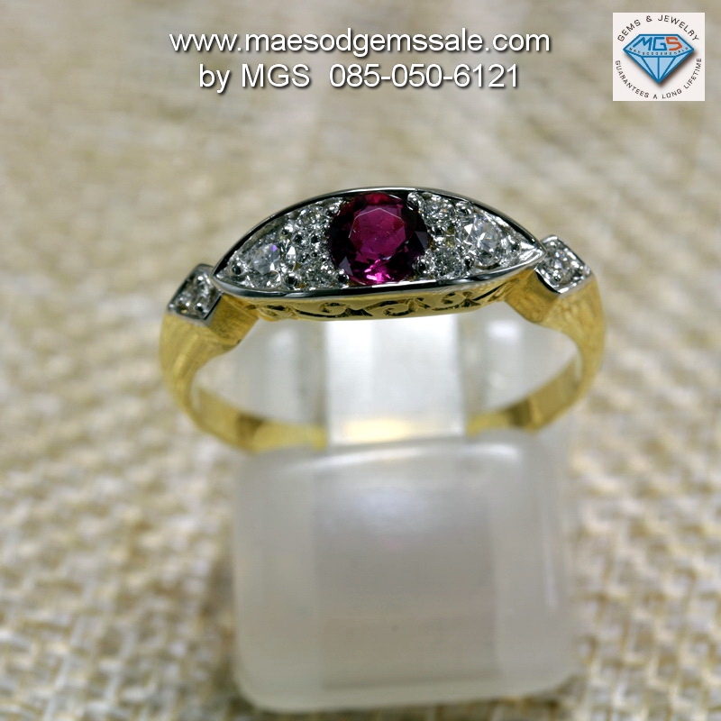 แหวนนิหร่าพม่า พลอยดิบ สีม่วงทรงนูนไข่ ทองคำแท้ ล้อมเพชรน้ำ97-98 ขนาดแหวนเบอร์ 56(ปรับขนาดฟรี)